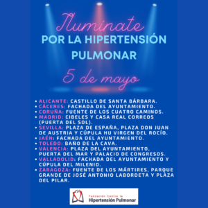 Iluminación por el Día Mundial de la Hipertensión Pulmonar Estos serán los edificios y monumentos que se iluminarán de color azul el día 5 de mayo #díamundialdelahipertensiónpulmonar. El color azul representa la coloración que toman los afectados de #HipertensiónPulmonar por la falta de oxigenación. Gracias a todos los ayuntamientos por…