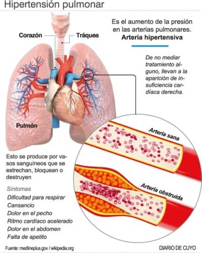 La hipertensión pulmonar es un padecimiento que provoca presión arterial alta en los vasos sanguíneos que transportan sangre a los pulmones. Cuando esto sucede, el corazón tiene que trabajar más de lo normal, lo cual produce dificultad para respirar y mucho cansancio.