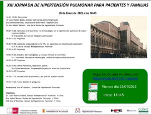 XIII JORNADAS DE HIPERTENSIÓN PULMONAR PARA PACIENTES Y FAMILIAS clEste viernes 28 de enero a las 14:45, darán comienzo las XIII Jornadas de Hipertensión Pulmonar para pacientes y familias. Organizado por el Hospital Universitario Clínic de Barcelona. Estas jornada se enmarca dentro de las actividades que la Unidad de Hipertensión…